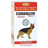 Cosequin plays an important role in maintaining joint function. It helps support cartilage production and protect existing cartilage from breakdown. Cosequin Multi offers total joint health and protection with multivitamins and minerals in a one-a-day tablet. If your dog is taking a multivitamin/mineral supplement and a joint supplement, Cosequin Multi may be right for you. This bottle contains 45 scored chewable tablets and is for large dogs 50 pounds and over.