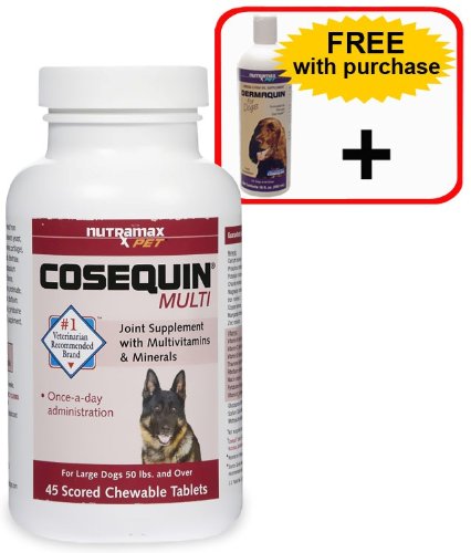 *Purchase One bottle of any Cosequin chewables or capsules. Get one free bottle of Dermaquin for dogs omega-3 fish oil supplement.Cosequin Multi Once-A-Day Supplement for Large Dogs 50 lbs. and Over (45 Chewable Tablets) + Dermaquin Omega-3 Fish Oil Supplement for Dogs (16 fl oz.)COSEQUIN MULTI Once-A-Day Supplement for Dogs: is a Once-a-day joint maintenance formula with multivitamins and minerals that is the great choice for dogs on a joint supplement and a multivitamin. COSEQUIN MULTI Once-a-Day Supplement is great for everyday joint health protection and overall wellness.Dermaquin: is formulated for skin and coat health source of omega-3 fatty acids derived from salmon and other cold water fish. Omega-3 fatty acids help support the skin and coat plus the following areas: Normal heart rhythm Renal function The nervous system Trainability Joint tissues