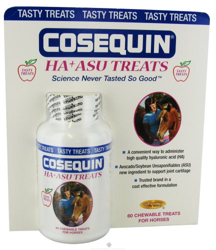 Nutramax Labs Cosequin HA+ASU Treats for Horses Nutramax Labs Cosequin HA+ASU Treats for Horses offer high quality HA plus ASU in a tasty formulation from a trusted brand. Cosequin HA+ASU Treats offer a convenient way for horse owners to add HA and ASU to their current Cosequin joint health regimen. Horse owners can combine them with any of the other Cosequin Equine Powder products to assist in the joint health of their horses. A convenient way to administer high quality hyaluronic acid (HA) and avocado/soybean unsaponifiables (ASU), a new ingredient to support joint cartilage Trusted brand in a cost effective formulation Why HA and ASU?Hyaluronic acid is a major component of synovial fluid, the substance that helps keep joints lubricated. Avocado/soybean unsaponifiables has been shown in cartilage cell studies to lower the expression or production of several compounds involved in the process of cartilage breakdown in joints.
